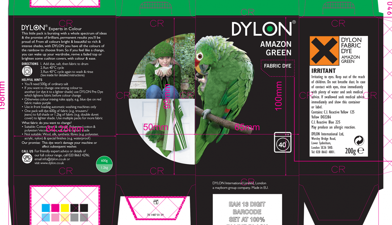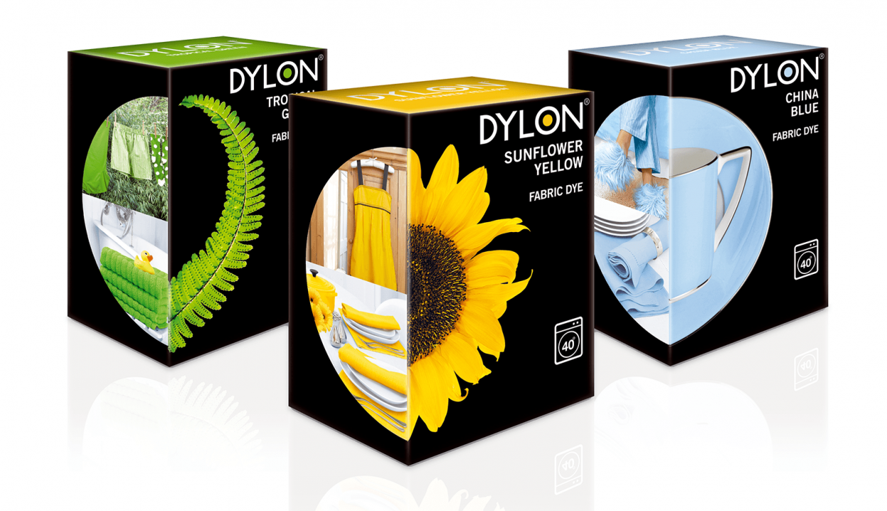 In 2007 the Dylon range of dyes were redesigned in a fresh and bold way using a black base colour and then introducing coloured images that pop against it. It is still on shelf today!